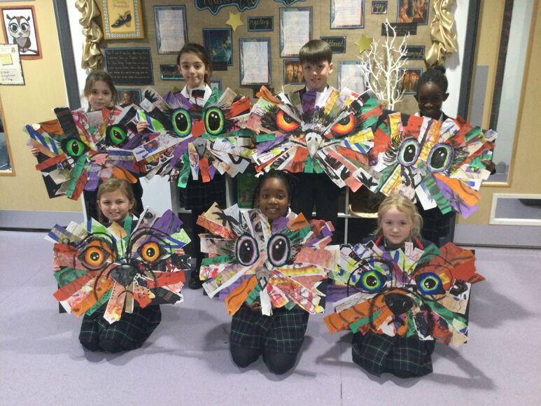 Online tutorials helped us learn how to use a range of oil pastel colours to create a graduated ombre effect for the huge eyes. The children carefully painted expressive lines with Indian ink to bring the features of the animals and birds together. They were delighted with the overall effect!